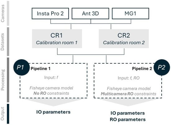 Finally, the computed IO parameters and, in P2 only, the adjusted RO parameters, were exported. Figure 8 summarizes the calibration process, which outputs four calibration sets for each camera: CR1-P1, CR1-P2, CR2-P1, and CR2-P2.