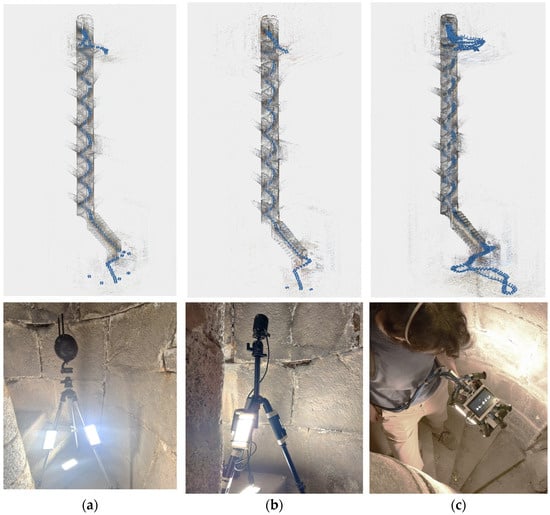The core of the spire features a column made of marble blocks with a diameter of about 40 cm, around which the ramp ascends. The passage left for traversal is extremely narrow, approximately 70 cm wide. This constrained space would pose a significant challenge for any kind of surveying methodology, particularly due to the revolving nature of the staircase, which impedes imaging of the staircase’s top from a bottom viewpoint, resulting in limited visibility from any position along the stairs. For these reasons, the spiral staircase has been used as a test site in previous experiments [31,33,44].