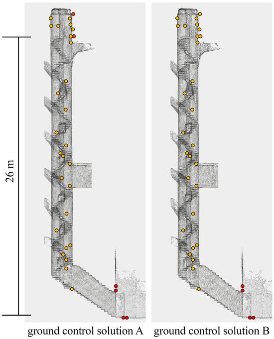GCPs and CPs were identified on easily recognizable architectural features for a total of 33 points evenly distributed at the base, at the top, and along the staircase. The results were evaluated based on two different constraint scenarios (Figure 10):