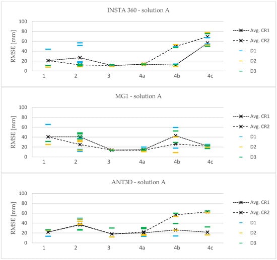 In terms of interior orientation, fixing the IO parameters without the multi-camera constraint (pipeline 2) typically does not yield significant accuracy improvements compared to pipeline 1. For the INSTA 360 Pro2, the average and minimum RMSE values remain fairly consistent, while the maximum increases. In the case of MG1, significant improvements are observed in specific cases (e.g., D1), yet the variability remains notably high, with maximum RMSE values reaching up to 49 mm and precision equal to 35.2 mm. For the two spherical cameras, this behavior seems to be affected by the two different calibration sets (Figure 11). Analyzing the distinct average values for each calibration reveals that they display differing behaviors, with better performance achieved using the parameters derived from CR2. In contrast, for ANT3D, the behavior is the opposite: fixing the IO parameters results in a substantial reduction in accuracy, and the performance of the two calibration sets is the same.