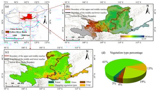 As a vital water resource and ecological zone in China [40,41], the YRB is responsible for supplying water to major grain producing and densely populated areas [42]. It is located between 94° to 120°E and 30° to 42°N, originating from the Bayan Har Mountains [49,50,51]. The basin features diverse topography, with elevation gradually increasing from the southeast to the northwest (Figure 1a,b), encompassing a total area of approximately 795,000 km2 [43]. Upstream is primarily mountainous, the midstream is characterized by loess landforms, and the downstream consists of plains and hills. Diverse topography has resulted in a wide range of climatic conditions within the basin, including arid, semi-arid, and semi-humid types (Figure 1b,c) [52]. Due to the region’s complex and diverse climate, the YRB supports a wide range of vegetation types [53]. Grasslands account for about 61% of the total area, changing vegetation types account for about 19%, croplands account for about 13%, forests account for roughly 3%, and other types account for about 4% (Figure 1d).