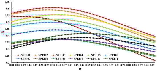 The SPEI indices of different time scales can reflect different types of droughts. Among these, vegetation drought typically refers to drought conditions with a shorter duration, generally lasting less than 12 months [59,74,75]. Consequently, we selected the SPEI across time scales of 1 to 12 months to investigate the optimal weighting values of VCI and TCI within the VHI. The growing season, which spans from April to September, was chosen for this study [13,76].