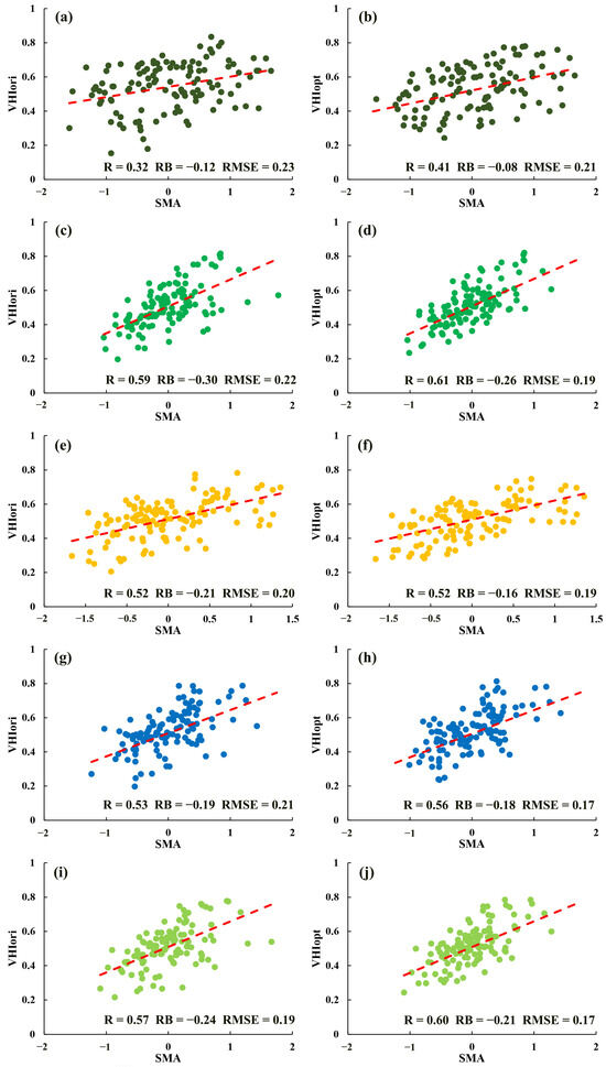 Scatter plots of SMA versus VHIori and SMA versus VHIopt under different vegetation types (forest (a,b), grassland (c,d), cropland (e,f), changing vegetation types (g,h), and all vegetation types (i,j)) and the red dashed lines in all subfigures represent the lines of linear fit.