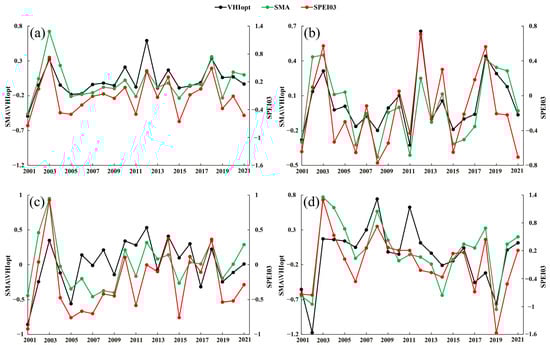 Time series plots of VHIopt, SPEI03, and SMA during the growing season (YRB (a), upstream (b), midstream (c), downstream (d)).