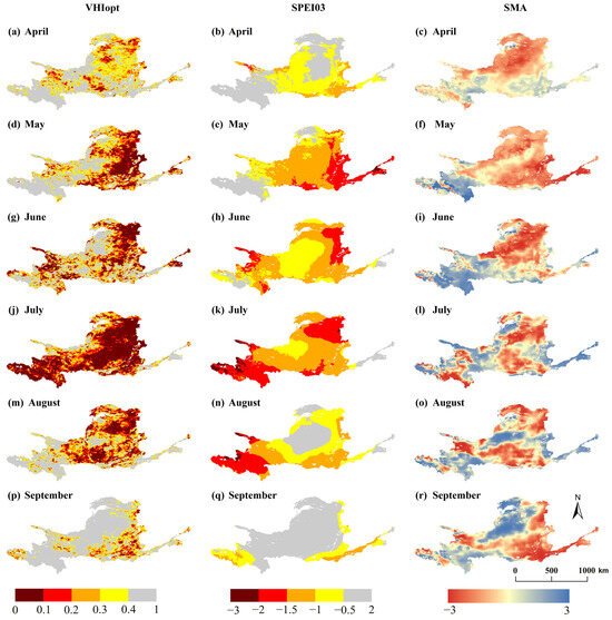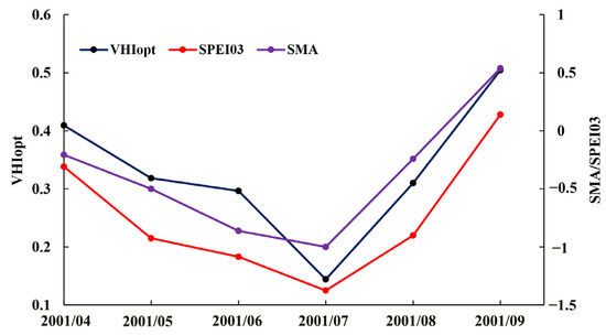 Figure 5 illustrates that the VHIopt anomalies reveal a gradual spread of agricultural drought across the YRB from April to July, with the most severe drought conditions occurring in July. Subsequently, the drought conditions began to ease between July and September. Moreover, the spatial distribution pattern of agricultural drought monitored by SMA and SPEI03 is largely consistent with that monitored by VHIopt. In order to further evaluate the enhancement of VHIopt on time series, the changes in the VHIopt for 2001 were compared with those of SPEI03 and SMA. As shown in Figure 6, during the growing season of 2001, the VHIopt initially decreased, reached its lowest value in July, and then increased. This pattern aligns with the results in Figure 5, which indicate that the overall drought conditions in 2001 gradually eased. The time series of VHIopt aligns well with both SMA and SPEI03, demonstrating that VHIopt effectively captures the temporal variations and trends in agricultural drought.
