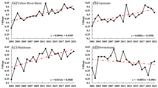 Temporal evolution of VHIopt and the red dashed lines in all subfigures represent the lines of linear fit.