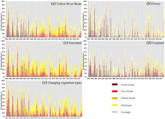 Arid area is not only a significant characteristic of drought but also a vital indicator for evaluating the severity of drought conditions. To further understand the temporal evolution of drought, we calculated the percentage changes in drought areas at the monthly scale during the growing season for different vegetation zones and the YRB. Figure 8b–e shows that the percentage changes in drought areas for forests, grasslands, croplands, and changing vegetation types, respectively. Among them, forests exhibited the greatest fluctuation in drought areas, especially during the growing seasons of 2005, 2007, and 2021. The extreme and severe drought areas in forests were mainly concentrated between 2001 and 2007, as well as in 2009, 2011, and 2017, with most years dominated by moderate and mild drought, indicating a weaker sensitivity to drought conditions. From 2001 to 2021, the variability in drought area was smaller for grassland, cropland, and variable vegetation types compared to forests. Extreme and severe droughts occurred in grassland, cropland, and variable vegetation types, with similar proportions of extreme and severe drought areas across these three types. Extreme and severe droughts occurred in all three vegetation types, with similar proportions of extreme and severe drought areas. As illustrated in Figure 8a, the YRB exhibited the smallest fluctuation in drought areas, with extreme and severe drought occurring throughout the period from 2001 to 2021, similar to the patterns in grasslands, croplands, and changing vegetation types. Additionally, the total no drought area across forests, grasslands, croplands, changing vegetation types, and the YRB showed increased fluctuation from 2001 to 2021, indicating that drought conditions in the YRB have generally weakened.
