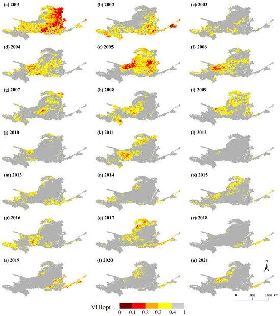 Spatial distribution maps of VHIopt from 2001 to 2021.