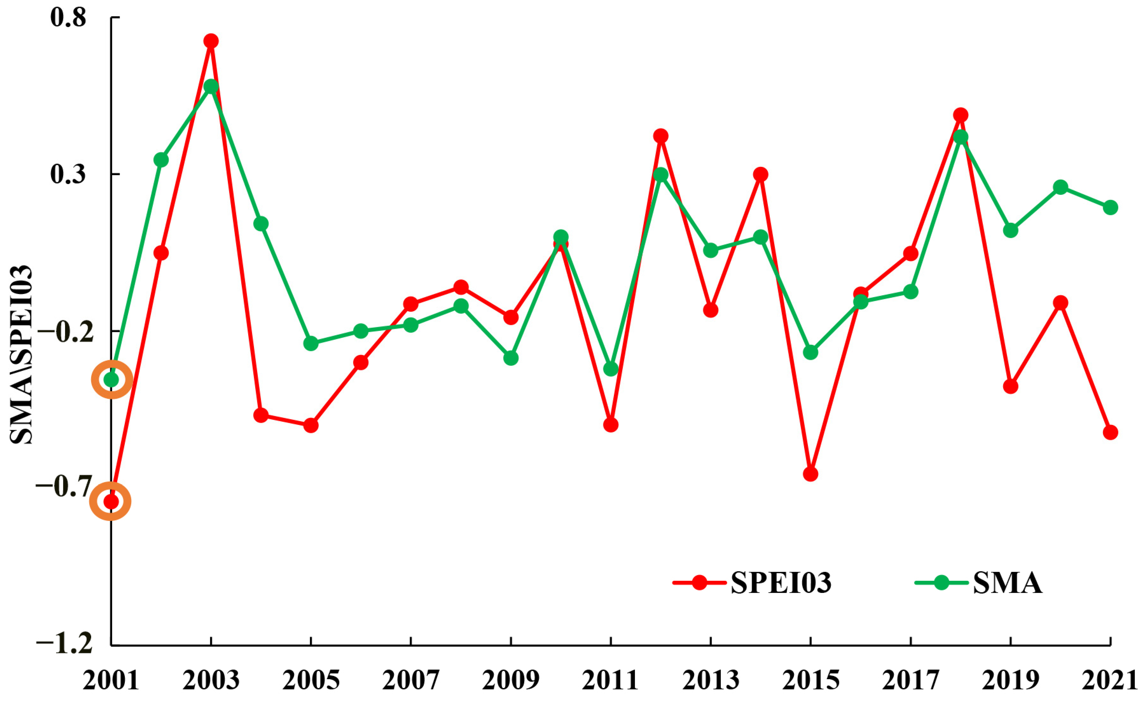 However, the natural conditions in different regions lead to variations in the actual values of soil moisture. SMA normalizes these regional differences, highlighting deviations more clearly and making SMA a key element in many practical drought monitoring systems [71,72]. The formula for calculating SMA is [72]: