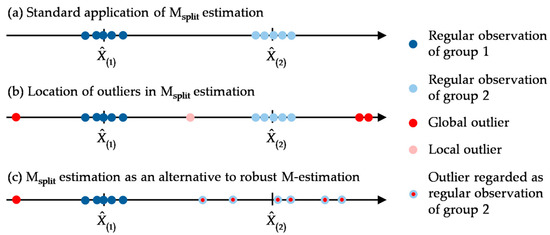Figure 1 illustrates the general idea of Msplit estimation in panel (a), when location parameters of both observation groups are estimated resulting in the estimates and . Panel (b) presents different types of outlying observations and their locations within regular observations. Panel (c) shows how Msplit estimation can be used as a conventional robust procedure. Here, one is only interested in estimating , and the estimate is supposed to describe the location of outliers in general and can finally be omitted.