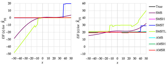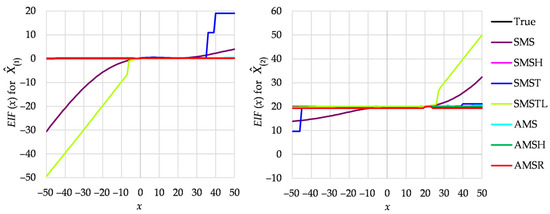 Figure 2 presents EIFs for the constant global outlier g = 30, whereas Figure 3 for the constant local outlier g = 10. In both figures, the left panel concerns whereas the right one concerns . One can conclude that SMS estimation cannot provide satisfactory results in both cases. The other basic variant, namely AMS estimation, provides acceptable results for all values of outliers. The same applies to the globally robust methods, except SMST estimation, which fails for the biggest absolute values of x. SMSTL estimation confirms its expected local robustness and, at the same time, shows sensitivity to global outliers.