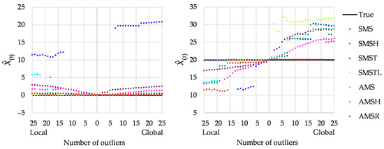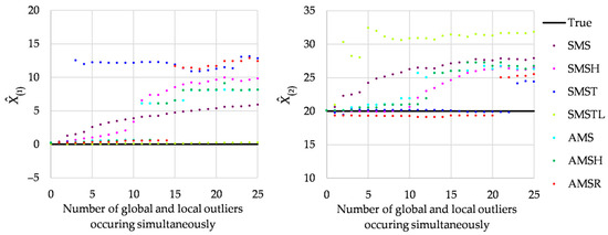 Let us now concern more outliers. The regular observations are as in Equation (6). Outliers are simulated as uniformly distributed: global outliers use U(25, 35), whereas local outliers assume U(5, 15). Each time, the observation set consists of all regular observations and outliers additionally (of respective type and number). Hence, one can examine how Msplit estimates change for a growing number of global or local outliers. Figure 4 presents the estimates in the left panel and in the right one. Each panel presents values of the estimates in question for different Msplit estimation variants and the growing number of global or local outliers. The number of global outliers rises from 0 to 25 rightward, whereas the number of local outliers rises from 0 to 25 leftward.