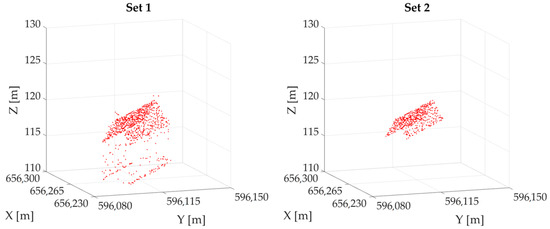 The first object is a gable roof of one of the buildings at the campus of the University of Warmia and Mazury in Olsztyn, Poland. Data were downloaded from https://www.geoportal.gov.pl (accessed on 4 August 2024). The point clouds (applied observation sets) are presented in Figure 6. The first set contains 945 points, including some outliers. The measurements of walls and ground should be classified as negative outliers, whereas ventilation chimneys, etc. are the positive outliers. The second set contains 576 measurements of the roof slopes when all outliers are excluded.