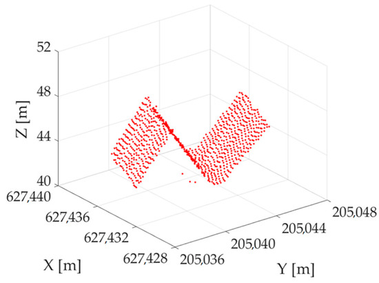 The second object is the part of the roof of the Philharmonic in Szczecin, Poland, that has an ice-like shape. Data were downloaded from https://www.geoportal.gov.pl (accessed on 6 November 2024). The ALS point cloud contains 956 points, as presented in Figure 7.