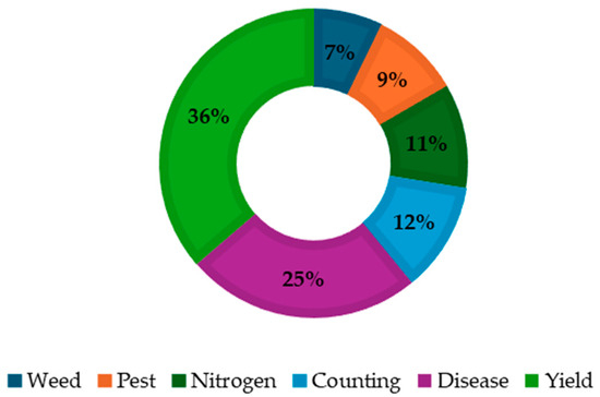 The percentages of research articles (2020–2024 October) published when the keywords nitrogen, disease, yield, counting, pests, and weed are searched separately in the Web of Science database with agriculture and digital image processing keywords.