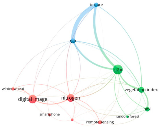 Term co-occurrence maps for 5 years (2020-2024 October), developed using the keywords, nitrogen, agriculture, and digital image processing, showing the importance of nitrogen and images in nutrient management and developing their relationship with digital image and processing. UAV: Unmanned Aerial Vehicle; NDVI: Normalized Difference Vegetation Index.