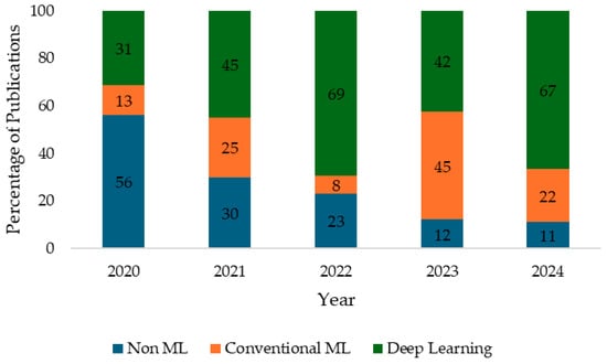 Percentage of publications that have used conventional machine learning and deep learning algorithms in their studies in the last 5 years (2020–2024 October).