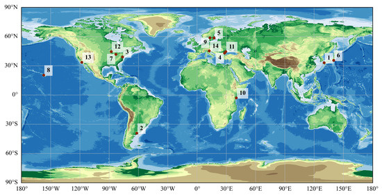 In-situ data from a total of 14 stations from AERONET-OC and MOBY spanning from 2021 to 2023 were used in this study. The locations of the stations are shown in Figure 1, and detailed information is presented in Table 2. For the AERONET-OC data categorized into three quality levels, the highest quality Level 2.0 data were used in this study. For MOBY data classified into four levels, the “Good” quality data were chosen. Following Pahlevan et al. (2021) [51], the provided by AERONET-OC and MOBY was divided by the top-of-atmosphere solar irradiance () [56] to obtain the as shown in Equation (1), where denotes the wavelength: