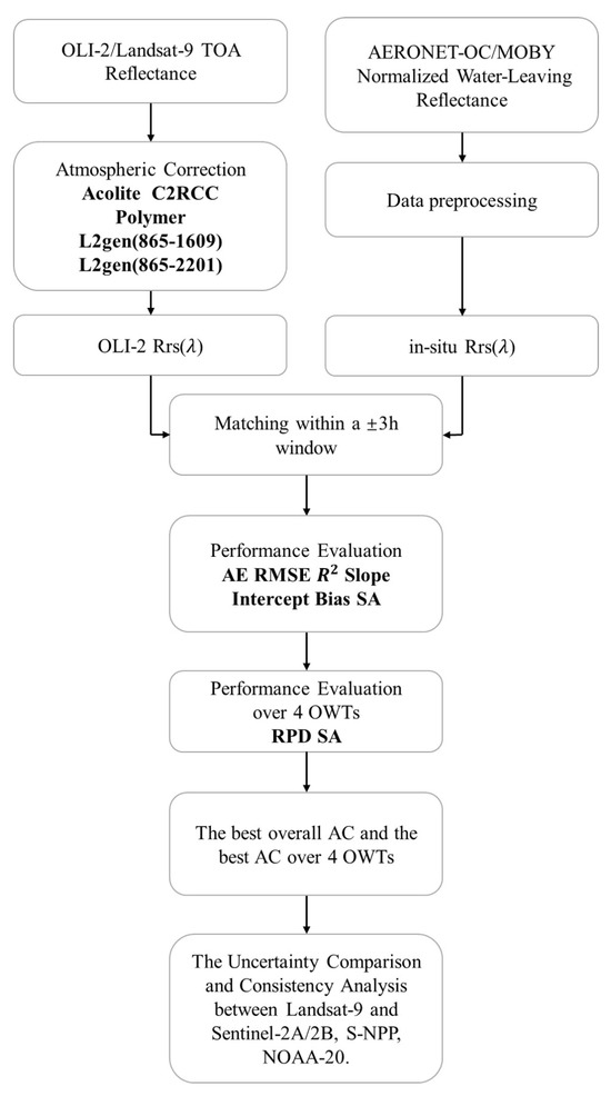 In this study, in-situ measurements were first utilized to evaluate uncertainties in water surface reflectance obtained from OLI-2/Landsat-9 processed by six atmospheric correction methods, including DSF, C2RCC, iCOR, L2gen (NIR–SWIR1), L2gen (NIR–SWIR2), and Polymer. Following this, a comparison of the consistency and uncertainty differences between OLI-2/Landsat-9 and two on-orbit sensors, MSI/Sentinel-2A/B and VIIRS/S-NPP/NOAA-20, was conducted. The flowchart of this study is illustrated in Figure 2.