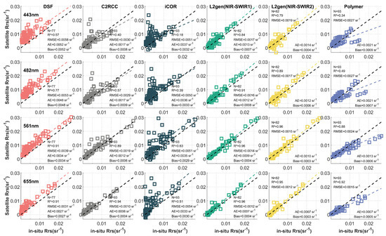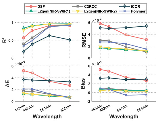 Figure 3 shows the scatter plots comparing the values at 443 nm, 482 nm, 561 nm, and 655 nm bands derived from OLI-2/Landsat-9 data using six AC methods (DSF, C2RCC, iCOR, L2gen (NIR-SWIR1), L2gen (NIR-SWIR2), and Polymer) with in-situ measurements. Figure 4 presents the variations in error metrics (, AE, RMSE, and Bias) of the six atmospheric correction methods with wavelength. Table 4 lists values of the error metrics for the six AC methods.