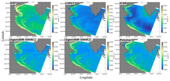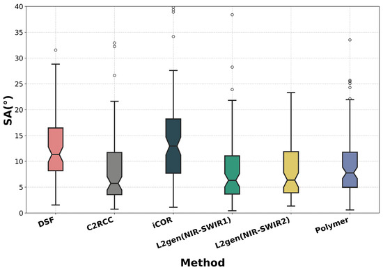 Figure 5 shows the SA of the results processed by the six AC methods used in this study. Significant differences in SA can be observed among different AC methods. The C2RCC and L2gen exhibit the smallest median SA values, with C2RCC at and L2gen showing and for its two spectral combinations, reflecting a more concentrated SA distribution with a relatively narrow interquartile range. This is followed by Polymer, with median SA values of , then comes DSF with a median SA of . The iCOR has the largest median SA of , with the longest box plot indicating poor stability.