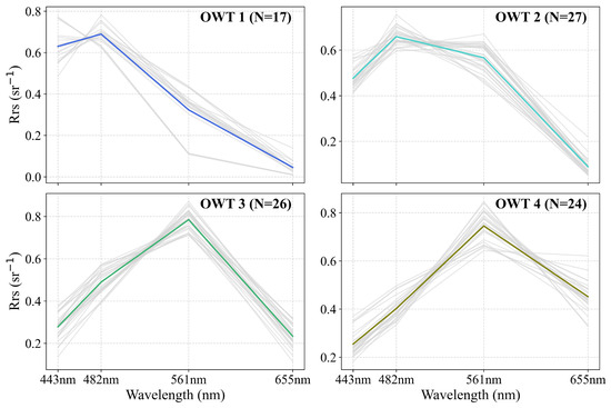 Normalized spectra of four OWTs in this study. The colored lines represent the average spectra for each OWT, while the gray lines represent the normalized in-situ measured spectra.