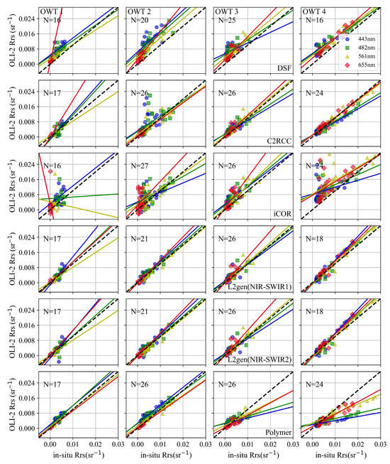 Scatter plots between OLI-2/Landsat-9 and in-situ data for six AC methods across four visible wavelengths (443 nm, 482 nm, 561 nm, and 665 nm) over four OWTs (OWT1, OWT2, OWT3, and OWT4). The subplots in the same column represent one specific water quality type (OWT1 to OWT4, from left to right), and the subplots in different rows correspond to varying atmospheric correction methods (DSF, C2RCC, iCOR, L2gen(NIR-SWIR1), L2gen(NIR-SWIR2), and Polymer from top to bottom). Four different wavelengths of 443 nm, 482 nm, 561 nm, and 655 nm are indicated by blue, green, yellow, and red, respectively. The dashed line represents the 1:1 line, while the solid lines are the regression lines at individual wavelengths.