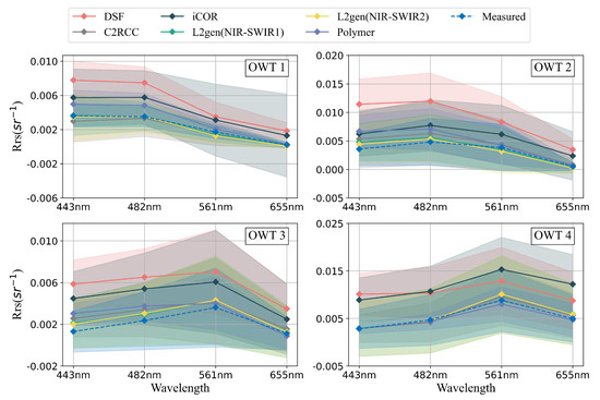 From Figure 8, Figure 9 and Figure 10, and Table 5, L2gen (NIR-SWIR1) and L2gen (NIR-SWIR2) consistently rank in the top two across four spectral bands in OWT1, OWT2, and OWT3. However, in turbid waters of OWT4, a slight overestimation for at 561 nm and 655 nm can be observed in Figure 8 and Figure 10. The L2gen (NIR-SWIR1) slightly outperforms L2gen (NIR-SWIR2) in OWT1, OWT2, and OWT4, while L2gen (NIR-SWIR2) shows a smaller RPD in the moderately turbid water of OWT3. This is consistent with the findings of Pahlevan et al. (2017) [39] that L2gen (NIR-SWIR2) produces more robust in moderately turbid waters.