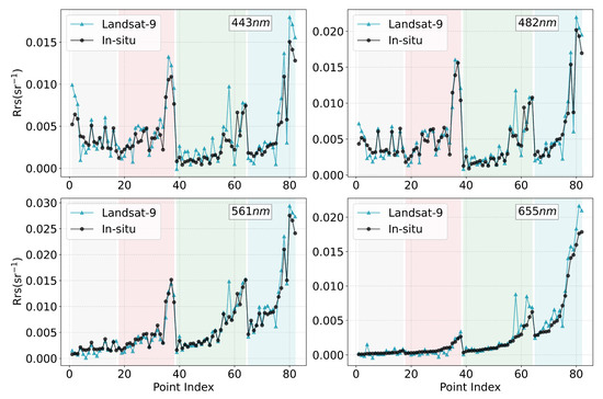 From Figure 11, it is evident that Landsat-9 data processed using L2gen (NIR-SWIR1) exhibit high consistency with in-situ measurements across various OWTs, demonstrating Landsat-9’s robust capability to accurately capture spectral characteristics. However, it is also worth noting that relatively higher uncertainty exhibits at the blue band, which should be taken into consideration when interpreting results in this spectral region.