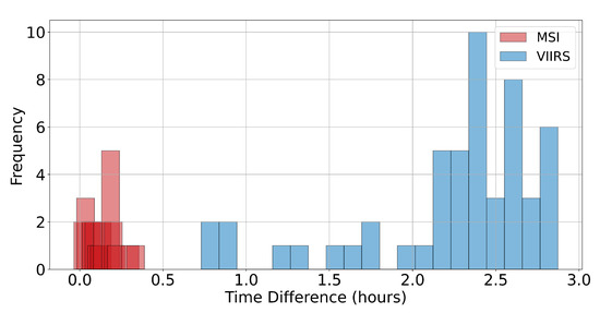 In this study, a time window of ±3 h was chosen to match the MSI, VIIRS, and OLI-2 data, as well as the in-situ measurements from AERONET-OC. Note that, with the long revisit period of 16 days for the OLI-2/Landsat-9 data, it is difficult to obtain concurrent matchups for MSI, VIIRS, and OLI-2 data on the same day. Thus, the OLI-2 data were matched up with MSI and VIIRS, respectively. Since VIIRS has a revisit period of about one day, 52 valid matchups were obtained between OLI-2 and VIIRS. MSI, with a revisit period of six days, resulted in only 23 matchups with OLI-2. Figure 12 presents the statistics of the overpass time differences of OLI-2 versus MSI and VIIRS matchup points obtained in this study. It can be seen that the matchup data between MSI and OLI-2 are nearly simultaneous within 30 min, while the time differences between VIIRS and OLI-2 are greater, with a median average of 2.4 h.