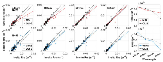 The long revisit period of approximately 16 days for the Landsat-9 data limits its applications in dynamic coastal areas; therefore, a joint use of multiple on-orbit spaceborne sensors, such as MSI/Sentinel-2 or VIIRS/S-NPP/NOAA-20, is usually necessary [40]. The uncertainty of MSI data has been assessed multiple times [39,45,51]. For VIIRS, as the successor to MODIS, the uncertainty and consistency of its products have also been validated and evaluated by the scientific community several times since it was launched in 2012 [47,48]. Notably, Pardo et al. (2023) [48] used datasets in the Atlantic Ocean to compare VIIRS data with Sentinel-3 and MODIS. However, there is still a lack of consistency assessments between MSI, VIIRS, and OLI-2 data in aquatic systems.