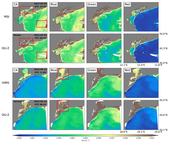 The spatial distributions of data at four visible spectral bands from OLI-2/Landsat-9, MSI/Sentinel-2B and VIIRS/S-NPP at the Venise station on 2 February 2022, and the Section-7 station on 12 May 2022. CA, blue, green, and red correspond to the 443 nm, 482 nm, 561 nm, and 655 nm bands, respectively. The spatial resolution of OLI-2, MSI and VIIRS is 30 m, 60 m, and 750 m.
