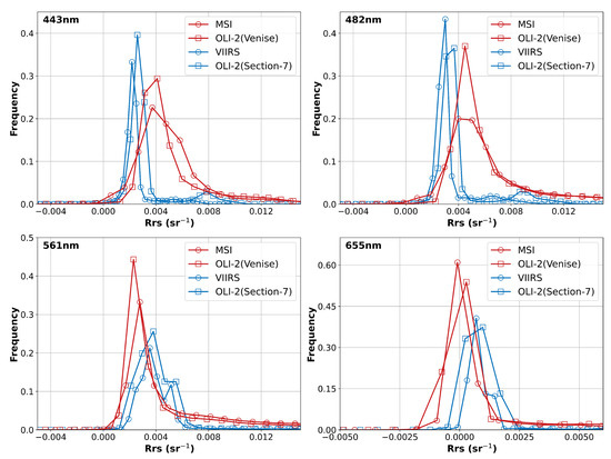 It is also worth noting that the overpass time difference is over two hours, during which the varying water optical properties could contribute to the observed differences. We observe that the discrepancies in lakes (marked in a red rectangle) are more significant than those in coastal waters, which we speculate could also result from the variable water optical properties in the lake, where the impact of multiple land activities is more pronounced. The noticeable cloud displacement within the red rectangle could also lead to inconsistencies in the frequency distributions. Additionally, as indicated by the red arrow in Figure 14, the MSI data suffer from pronounced striping effects at 443 nm and 482 nm, which could potentially be improved by utilizing the concurrent, smoother OLI-2 data.