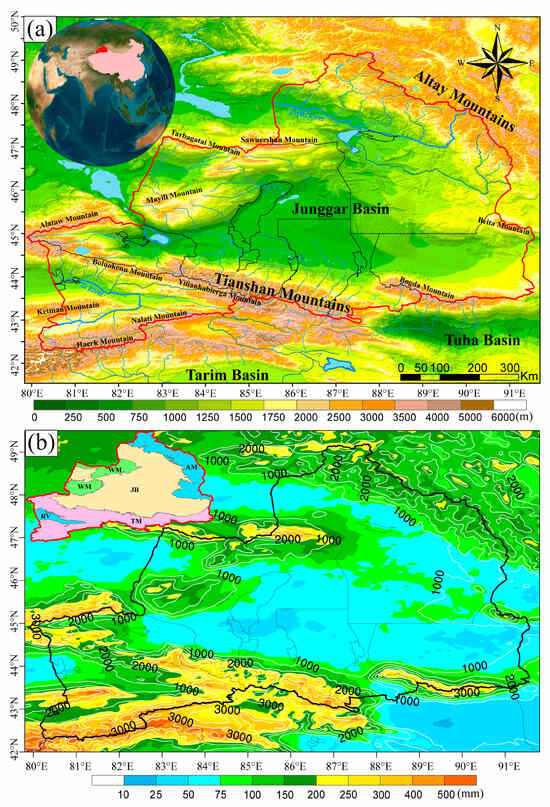 Figure 1. (a) Geographical location and terrain altitude (shading, unit: m) of the study area, the area within the red line represents Northern Xinjiang (NX, excluding Turpan and Hami), water-blue areas show lakes, and the water-blue lines represent rivers (the filled red area in the small globe in the upper left corner shows the location of the study area from a broad scope). (b) Spatial distribution of annually averaged accumulated summer (June–August) precipitation (shading, unit: mm) during the period of 2015–2019 and terrain altitude (white contours with intervals of 1000 m, the numbers in black font represent the isoheight lines of 1000 m, 2000 m, and 3000 m). The small illustration figure in the upper left corner shows the different regions divided according to terrain altitude in the study area (AM, TM, WM, JB, and RV represent for the Altay Mountains region, Tishan Mountains region, Western Mountainous region, Junggar Basin, and Ili River Valley, respectively).