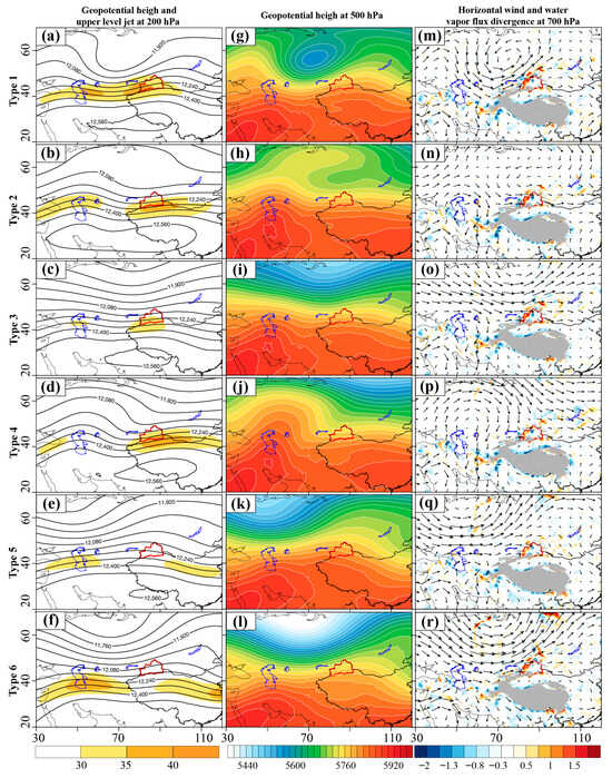 Figure 2. Six atmospheric circulation patterns (ACPs) were classified using the SANDRA method during the summers of 2015–2019 in Northern Xinjiang (NX) based on the NCEP FNL data. (af) Geopotential height (black lines, unit: gpm) and horizontal wind velocity (shading, unit: m s−1) at 200 hPa. (gl) Geopotential height (shading, unit: gpm) at 500 hPa; and (mr) the water vapor flux divergence (shading, unit: 10−3 g cm−1 hPa s−1) and horizontal wind velocity (vector arrows, unit: m s−1) at the 700 hPa. The bold red closed line in each panel represents the study area (i.e., NX).