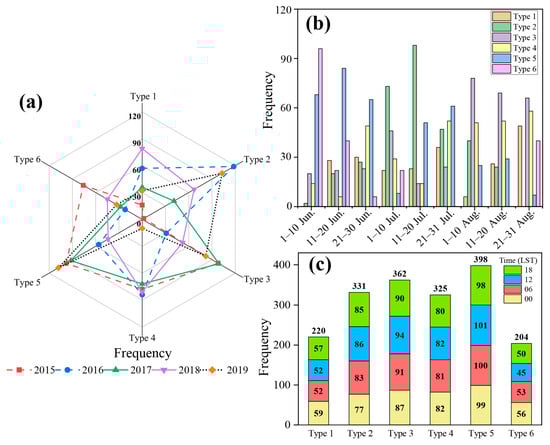 Furthermore, to investigate the DVCs of the six ACPs over the NX during the summer of 2015–2019, hourly occurrence frequencies of six ACPs are explored based on four periods of each day: 00 Local Solar Time (LST = UTC +6, midnight), 06 LST (morning), 12 LST (afternoon), and 18 LST (nightfall) (Figure 3c). In Type 1, the midnight period exhibits the highest frequency with 59 h. The afternoon and nightfall periods show the highest frequencies (with 86 and 85 h, respectively) in Type 2. The afternoon depicts the highest frequency with 94 h in Type 3, while the midnight and afternoon periods show the highest frequencies (both of them with 82 occurrences) in Type 4. In Type 5, the afternoon and morning periods demonstrate the highest frequencies, with 101 and 100 h, respectively. The midnight period shows the highest frequency, with 56 h in Type 6.