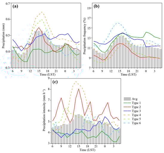Figure 4. Diurnal variation characteristics (DVCs) of (a) hourly averaged precipitation amount, (b) hourly averaged precipitation frequency, and (c) hourly averaged precipitation intensity in six types of ACPs in northern Xinjiang (NX) during the summer of 2015–2019 (the colorful lines represent the values in each type of six ACPs, and the grey bars show the averaged values for the whole summer).