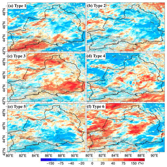 Figure 5. (af) Spatial distributions of precipitation anomaly percentages in six types of atmospheric circulation patterns (ACPs) in northern Xinjiang (NX) during the summer of 2015–2019 (shading, units: %, grey contours with an interval of 1000 m represent topography, and the numbers in black font represent the isoheight lines of 1000 m, 2000 m, and 3000 m).