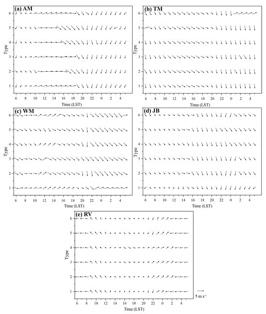 Figure 6. (ae) Diurnal variation characteristics (DVCs) of horizontal wind (vector arrows, unit: m s−1) at the model’s lowest eta level (eta = 1.00000, represents the near-surface level) of WRF-NJU data in the different regions divided according to terrain altitude in the study area during summer from 2015 to 2019 in six atmospheric circulation patterns (ACPs). The abbreviations in the upper left corner of each panel represent the different regions, i.e., AM, TM, WM, JB, and RV represent the Altay Mountains region, Tishan Mountains region, Western Mountainous region, Junggar Basin, and Ili River Valley, respectively (also shown in Figure 1b).