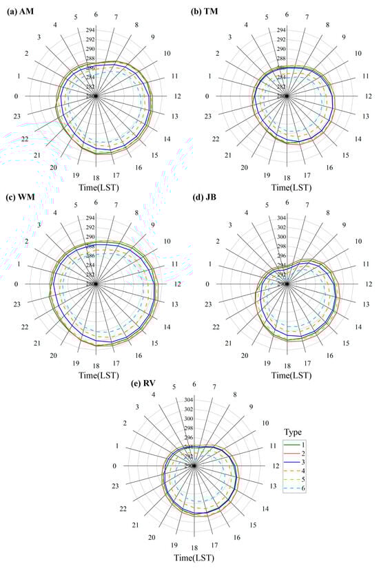 Figure 7. (ae) Diurnal variation characteristics (DVCs) of air temperature (colored contours, unit: K) at the model’s lowest eta level (eta = 1.00000, represents the near-surface level) of WRF-NJU data in the different regions divided according to terrain altitude in the study area during summer from 2015 to 2019 in six atmospheric circulation patterns (ACPs). The abbreviations in the upper left corner of each panel represent the different regions, i.e., AM, TM, WM, JB, and RV represent the Altay Mountains region, Tishan Mountains region, Western Mountainous region, Junggar Basin, and Ili River Valley, respectively (also shown in Figure 1b).