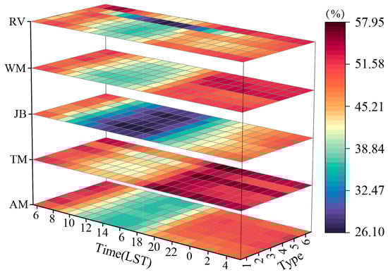 In mountainous regions, the RH under various ACPs in the AM region shows significant DVCs. The maximum RH (approximately 51.9%) occurs around 06 LST, while the minimum (about 36.3%) is found around 17 LST. The average RH is about 43.9% in Type 1, while it exceeds 45% under all other types. The smallest diurnal variation in RH is under Type 1, while the largest is under Type 2. The RH under the influence of Type 3 and 6 is noticeably higher than under other ACPs, thus providing sufficient moisture for precipitation in the region (Figure 5c,f). In the TM region, the maximum RH under different types of ACPs is about 56%, occurring around 20 LST, and the minimum is (about 42.8%) observed around 14 LST. The average RH under Types 5 and 6 corresponds to these minimum and maximum values, respectively. Type 5 shows the greatest diurnal variation in RH and Type 6 is the least (Figure 5e,f). In the WM region, the maximum RH under various types of ACPs is about 52.5%, occurring around 21 LST, and the minimum (38.4%) is observed around 14 LST. The average RH is around 45% under Types 2 and 3, and about 48% under Type 6. However, the diurnal variation in average RH is the smallest, with precipitation significantly higher than other types (Figure 5f); the largest variation occurs in Type 5.