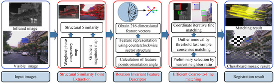 To simultaneously address the aforementioned issue, we propose a robust and efficient registration method for infrared and visible images. The proposed method primarily consists of three key components. We propose a structural similarity point extraction (SSPE) method for infrared and visible images, which generates weighted phase congruency (PC) and gradient magnitude (GM) maps for both image types. The structural similarity between feature points in the weighted PC and GM maps serves as the extraction criterion, enabling the extraction of reliable feature points while suppressing invalid ones. In the feature description stage, we propose a phase congruency-based rotation-invariant feature descriptor (RIFD), which leverages phase information’s robustness to NRD. The descriptor estimates feature-point-dominant orientation angles via histogram interpolation and divides the feature point’s circle domain into sectors to encode intrinsic phase features. This achieves rotation-invariant and improves matching reliability. We propose an effective coarse-to-fine matching strategy (EC2F) in the feature matching stage. Coarse matching generates numerous initial matches through nearest neighbor matching, followed by the removal of outliers using threshold-based fast sample consensus (FSC) [13]. In fine-matching, positional deviations caused by resolution differences and NRD are further corrected through coordinate-based iteration, improving the matching precision. To summarize, the main contributions of this work are as follows: