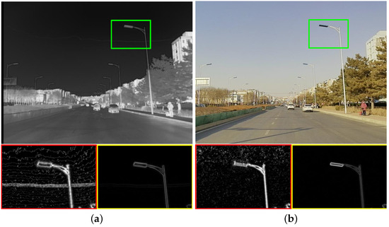 With the ongoing advancement of autonomous driving technology, optoelectronic imaging systems that incorporate both infrared and visible cameras are increasingly becoming integral components of vehicular vision hardware platforms. The fusion of complementary information from these two modalities within a unified coordinate system can significantly improve the accuracy of object recognition, tracking, and localization in advanced vision tasks for autonomous driving. However, due to differences in imaging mechanisms, sensor arrays, mounting positions, and lens focal lengths, the infrared and visible images must be registered before fusion. There are two existing methods for registration. The first method uses a common aperture optical [1] design to enable a shared optical path, simplifying the registration task. However, designing these systems is complex due to the need for precise optical manufacturing to ensure consistent performance across different spectral bands. Additionally, avoiding stray light or reflections is crucial to prevent image degradation. Consequently, common-aperture systems are expensive and less reliable, making them unsuitable for vehicular imaging systems. The second method relies on algorithms to register infrared and visible images. Since images are captured by separate imaging systems, each modality’s image quality can be independently optimized for advanced vision tasks. In current vehicular imaging systems with discrete units, the accurate registration of infrared and visible images is crucial for real-world applications, as shown in Figure 1.