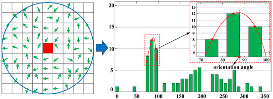 where represents the coordinates of the feature point, R represents the radius of the statistical region, indicates the angle of the point located at , specifies angle bin intervals, and denotes the histogram statistics. To find the index corresponding to the maximum value in , the interpolation linear equations are established, as described in Equation (10).
