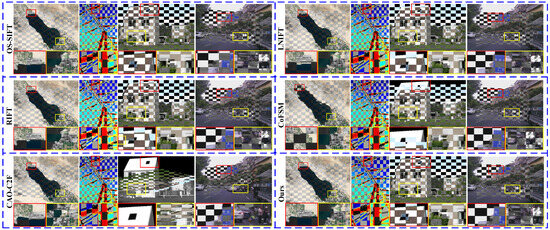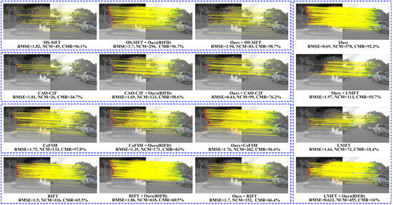 Matching Efficiency: To ensure comparability, we downsample a set of large images into a series of small images, thereby eliminating the effects on image content. In the experiment, we compare the performance metrics of each method from the completion of the feature description to the calculation of the final registration parameters. Given the significant differences in feature point extraction among the comparison methods, it is not feasible to require all methods to use the same feature points for matching. Consequently, we focus on comparing the efficiency of matching operations (NCM/(matching time)) for each method. The results are presented in Table 4. As the image size increases, the matching time for all methods, except LNIFT, also increases accordingly. This increase in image size leads to a rise in NCM for most methods, as larger images contain more detailed information. The RMSE of EC2F is higher than that of CAO-C2F only for the image sizes 300 × 300 and 1500 × 1500, while the RMSE for images of other sizes is optimal. Although EC2F is not the fastest in terms of running time, it achieves the highest number of correct matches per unit of time across all image groups.