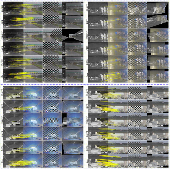 Generally, the existing infrared and visible image registration algorithms can be classified into three categories: area-based, feature-based, and deep learning-based methods [2]. Area-based methods use similarity metrics and optimization to estimate the geometric transformation parameters between infrared and visible image pairs. Feature-based methods estimate the transformation model by identifying the corresponding features between images. Deep learning-based methods are data-driven to establish correspondences between image pairs. However, intensity-based methods, such as mutual information [3,4] and normalized cross-correlation [5,6], require a global search for transformation parameters, which leads to high computational complexity. Deep learning-based methods [7,8,9] suffer from poor generalization and complex model structures that are not suitable for deployment in vehicular imaging systems. In practice, for the registration of infrared and visible images, feature-based methods [10,11,12] are usually recommended owing to their robustness to nonlinear radiation distortion (NRD) and geometric distortion. Although numerous feature-based methods have been proposed in recent decades, registering infrared and visible images still encounters the following challenges: