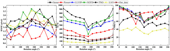 Rotation Performance: We test the effects of the RIFD on the matching performance metrics RMSE, NCM, and CMR across seven datasets, with image rotation angles ranging from 0° to 360°, as illustrated in Figure 11. The RMSE ranges from 0.78 to 2.32, with a notable trend indicating that the RMSE is generally higher between 150° and 250°. The NCM exhibits a trend of decreasing from 0° to 180° and subsequently increases from 180° to 360°; however, this trend is less pronounced in the TNO and UAV datasets. Additionally, Figure 12 displays images that illustrate the effects of rotation matching from the datasets.
