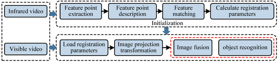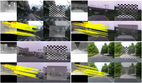 Since the relative positions of the two video streams are fixed, there is no need to compute the registration parameters in real-time. Instead, these parameters are calculated during the system initialization phase and stored in the configuration file, the registration process is illustrated in Figure 15. The registration results presented in Figure 16 demonstrate that the proposed method performs competitively across various scenes. However, it is evident that the matching performance in darker regions is suboptimal. In practical applications, the calculation of initial registration parameters should ensure that both the infrared and visible images are clear and that the overall brightness of the visible image is uniform. Table 6 presents the registration metrics for the vehicular imaging system.