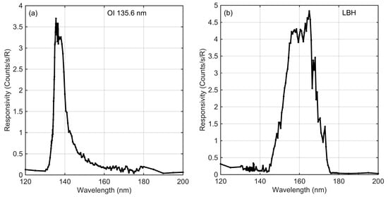 In the study of the thermosphere and ionosphere, the observations of the atomic oxygen at 135.6 nm (OI 135.6 nm) and nitrogen Lyman–Birge–Hopfield bands (LBH) radiances provide several important scientific objectives. These radiances result from energetic photon–electron impact excitation of the neutral atmosphere and are proportional to the concentrations of atomic oxygen and molecular nitrogen, respectively [6,7]. The temporal–spatial evolutions of these radiances can indicate variations of electron density, neutral composition, and temperature, which are valuable for investigating the dynamics of the thermosphere and ionosphere. For example, the OI 135.6 nm radiances, which are particularly sensitive to changes in the thermosphere and ionosphere, recently revealed many phenomena, such as the equatorial ionization anomaly (EIA), day–night brightness variation, and photoelectron impact excitation [8,9,10,11].