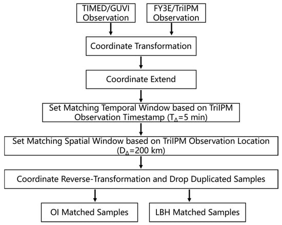 In this study, we address the challenges of cross-validating datasets from FY3E/TriIPM and TIMED/GUVI by implementing a careful data matching process. We consider two primary parameters: time and distance. Specifically, we only retain observations when the time difference is less than 5 min and the horizontal distance is less than 200 km. The flowchart of our method is shown in Figure 2. To minimize the impact of factors affecting emissions, such as solar zenith angle and local time, we concentrate our analysis on specific time periods. Given that FY3E is designed for dawn–dusk orbit observations, we focus exclusively on local times (LTs) of 0500 and 1700. This approach allows us to account for the instruments’ characteristics, orbital parameters, and data processing methods, ensuring a meaningful comparison between the two satellite systems.